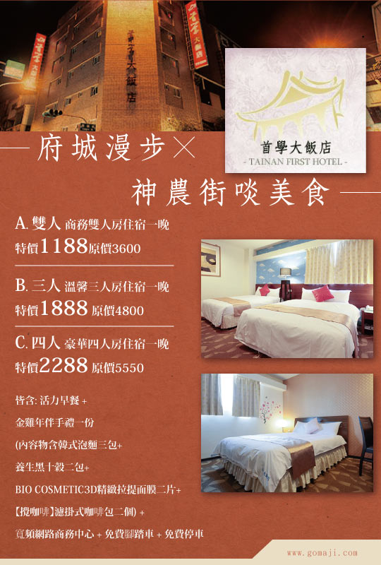 只要1188元起,即可享有【台南-首學大飯店】 府城漫步五條港、神農街啖美食〈含A.商務雙人房平日升等豪華雙人房/B.溫馨三人房/C.豪華四人房住宿一晚 + 活力早餐 + 金雞年伴手禮(內容物含韓式泡麵三包+養生黑十穀二包+BIO COSMETIC3D精緻拉提面膜二片+【攪咖啡】濾掛式咖啡包二個) + 寬頻網路商務中心 + 免費腳踏車 + 免費停車〉